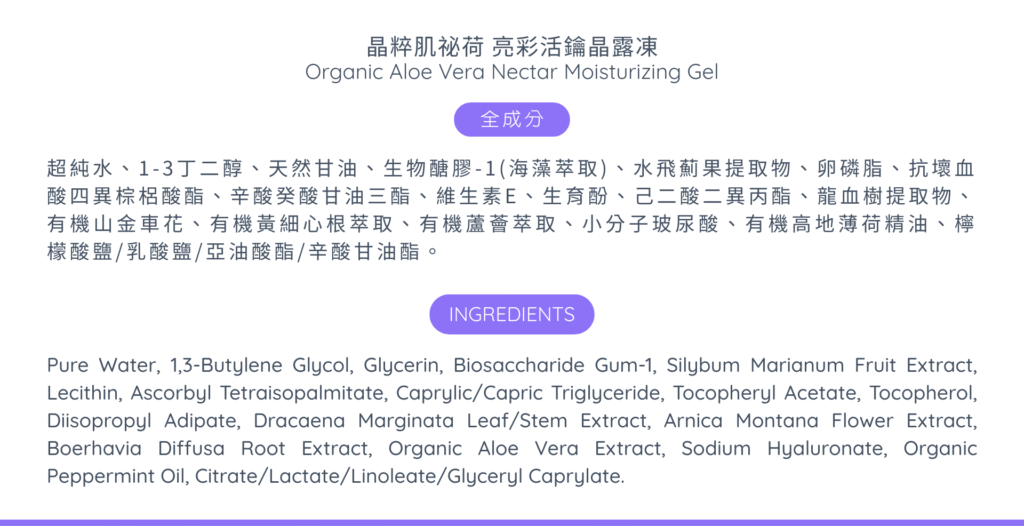 天然有機植物萃取,不含酒精、香精、礦物油、色素、螢光劑等成分。