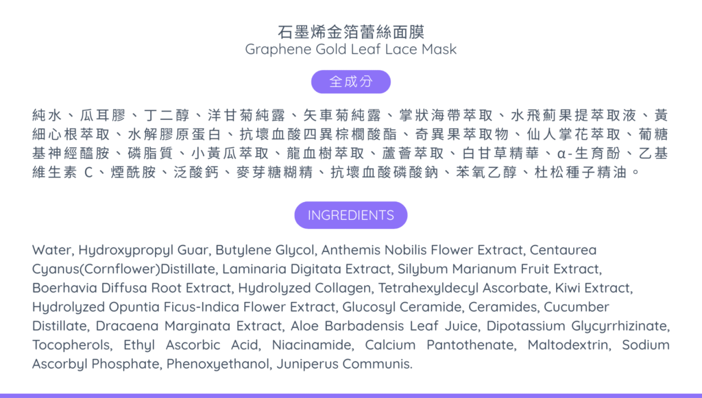 打開鋁袋取出面膜,將白色珍珠膜撕下,讓金箔蕾絲面膜紙向臉部平敷後,敷臉時間大約15 分到 30 分鐘後再取下蠶絲面膜布材即可。